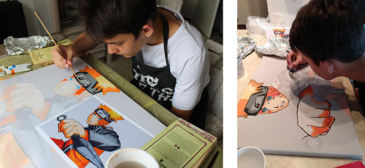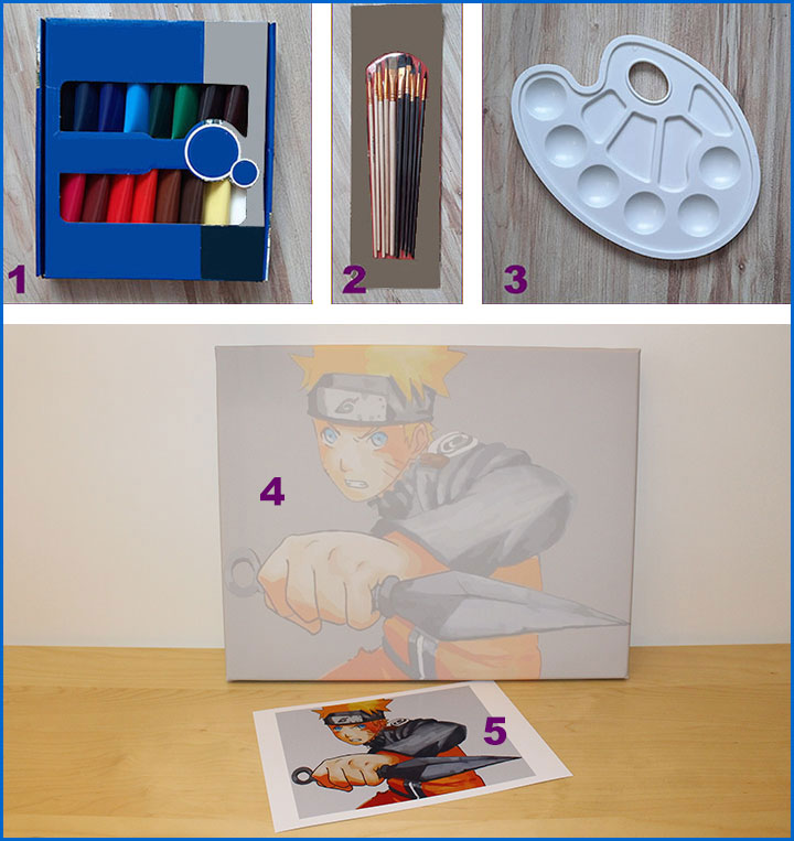 Wir senden dir deine auf Keilrahmen gespannte Leinwand (4) zusammen mit einer DIN A4 Vorlage (5) zu.